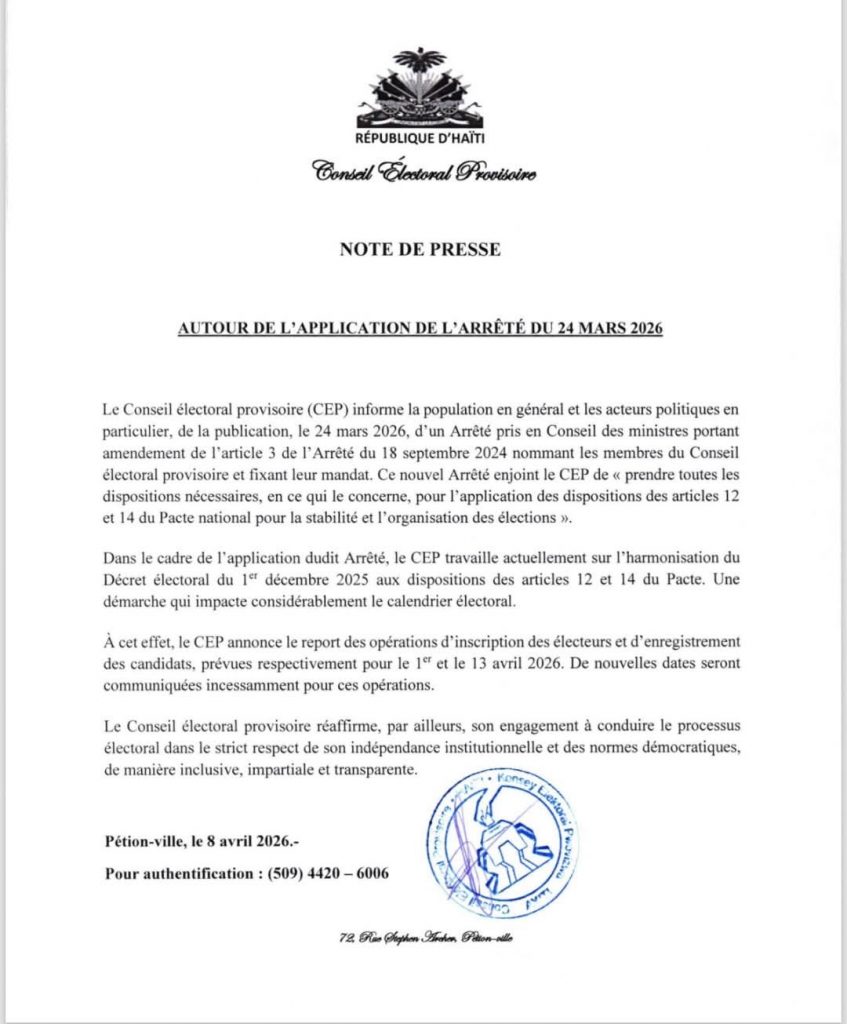 PORT-AU-PRINCE, April 8 (Reuters) – Haiti’s CEP electoral council said on Wednesday it was postponing a voter registration that should have begun on April 1, adding it would shortly announce new dates to register for the nation’s first presidential election in a decade.