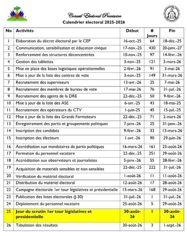 Depuis les élections de 2015, c’est la première fois que des dates sont fixées pour une compétition électorale en Haïti. Après le premier tour le 30 août, le second tour du scrutin aura lieu le 6 décembre 2026.
